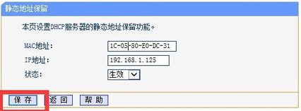 接着在打开的“添加新静态地址”界面中,输入要为其指定静态IP地址的网卡MAC地址和IP地址,点击“保存”按钮即可: