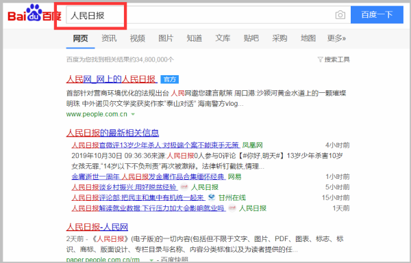 1、首先在百度里搜索人民日报,如下图所示;