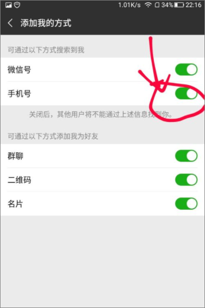 5、在添加我的方式页,点“手机号”将其关闭。这样就将电话号码隐藏起来了,新添加的好友不能直接看到手机号,保护隐私。