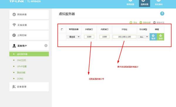 2、打开高级设置,把内部电脑所对应的电脑的IP,做3389端口映射。协议类型ALL。保存。
