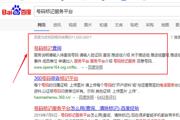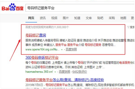 2、在百度浏览器搜索栏里面输入"号码标记服务平台”,在弹出来的选项中选择第一个点击进入.