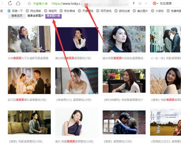 百度上打开天堂图片网并在搜索栏里输入需要下载的关键字,点击搜索,如图高圆圆,如图: