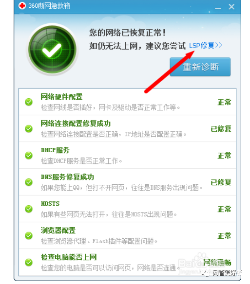 待利用此工具完成网络修复操作后,就可以尝试重新访问网络啦。如果仍然没有解决问题,可以点击“LSP修复”按钮。