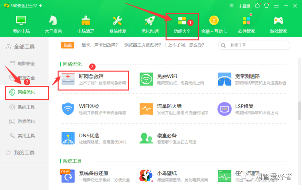 6、同时还可以借助“360断网急救箱”来检测网络故障以及修复相关电脑无法上网的问题。在“360安全卫士”-“更多功能”列表中找到“断网急救箱”工具打开。