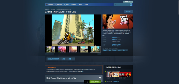 在安装steam后注册steam账号,后在商店搜索Grand Theft Auto: Vice City即可进入购买界面。玩家购买后即可入库进行安装下载。
