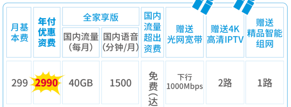 电信十全十美299档套餐,赠送2路高清IPTV。