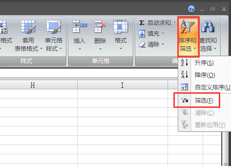 二、点击开始菜单下的“排序和筛选”,下拉菜单中点击“筛选”。