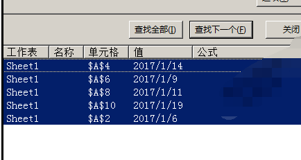 4.这时,把2017年1月的日期全都显示在查找对话框内;然后,按下CTRL+A ,全选中;