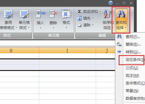 五、接着点击开始菜单下“查找和选择”,下拉菜单中点击“定位条件”。