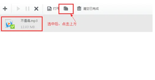8、下载完成后,选中歌曲行,单击上方的“所在文件夹”按钮,如下图所示。