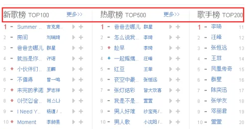 3、点击“百度一下”按钮后进入“百度音乐”首页,向下滚动鼠标滑轮,可以看到新歌榜、热歌榜、歌手榜等排行榜,选取自己喜欢听的歌曲下载,如下图所示。