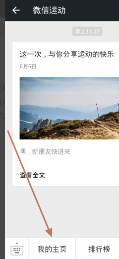 6、关注后,就可以进行微信运动公众号了。点击我的主页。排行榜还可以同你的朋友进行运动量PK。