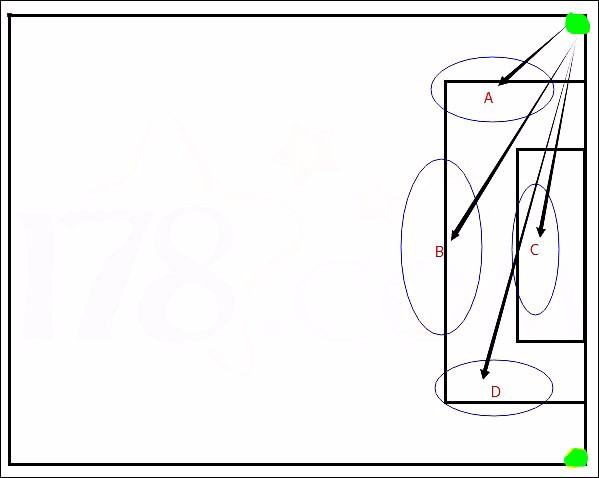 从上图可以看出,以上图标注的,以球场右半场的上角球为例一般角球的罚球,不同位置不同角度,自行摸索。相信也很。分为以上4种落脚点,那么接下来就根据4个落脚点来判断角球的攻防技巧。