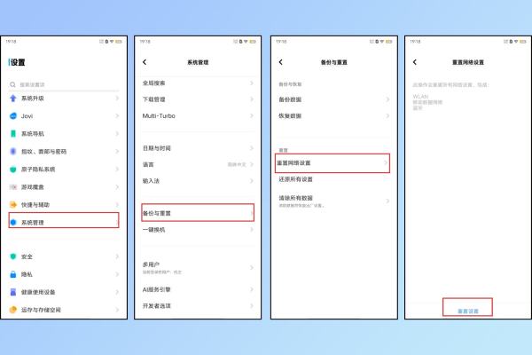 注:重置网络设置会清除WLAN、移动数据网络、蓝牙等连接记录;双卡时需选择对应的SIM卡。