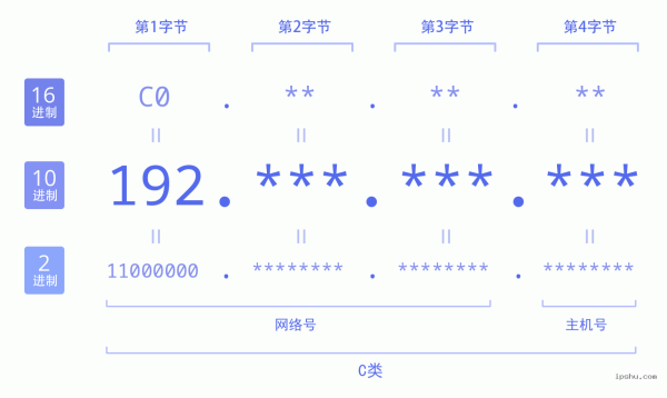 C类IP地址是指:在IP地址的四段号码(例如:字节1.字节2.字节3.字节4)中,前三段号码(字节1.字节2.字节3)为网络号码,剩下的后一段号码(字节4)为本地计算机的号码。