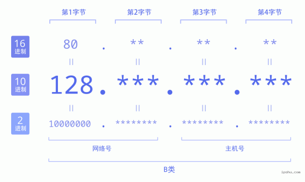B类IP地址是指:在IP地址的四段号码(例如:字节1.字节2.字节3.字节4)中,前两段号码(字节1.字节2)为网络号码,剩下的后两段号码(字节3.字节4)为本地计算机的号码。