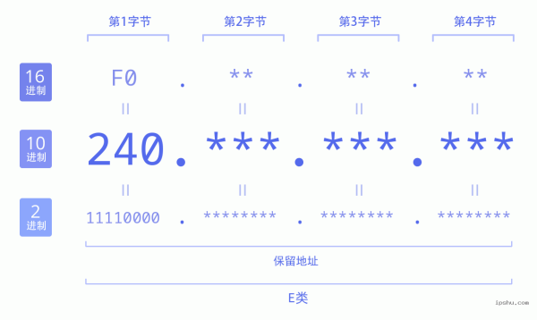 E类IP地址范围:240.0.0.0 ~ 247.255.255.255。
