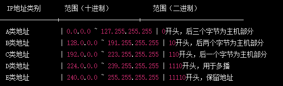 下面是一个图表,展示了不同IP地址类别的范围和二进制格式: