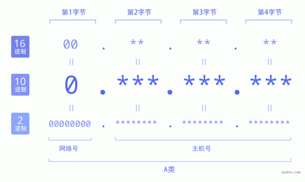 A类IP地址是指:在IP地址的四段号码(例如:字节1.字节2.字节3.字节4)中,第一段号码(字节1)为网络号码,剩下的后三段号码(字节2.字节3.字节4)为本地计算机的号码。