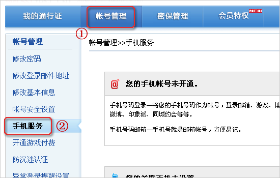 1、首先登录网易邮箱帐号,点击页面“帐号管理”--“手机服务”,进入手机服务页面;如下图: