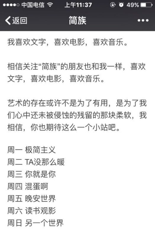 身为一个做新媒体的,我想我还是有资格回答这道题的,不想做太多推荐,以免造成信息过于繁杂,今天,推荐一个“用极简主义颠覆世界”的微信公众号,整个公众号设计极简,也倡导极简主义生活,气质很不一样。