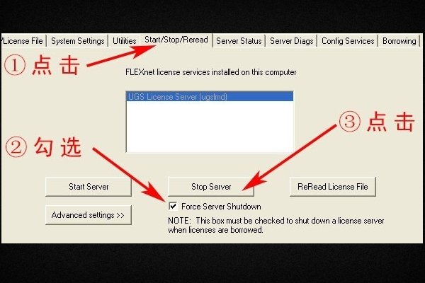 3打开LMTOOLS ,start\stop\reread界面,强制停止服务,开启服务两次,停止和开启时间间隔大于10s。