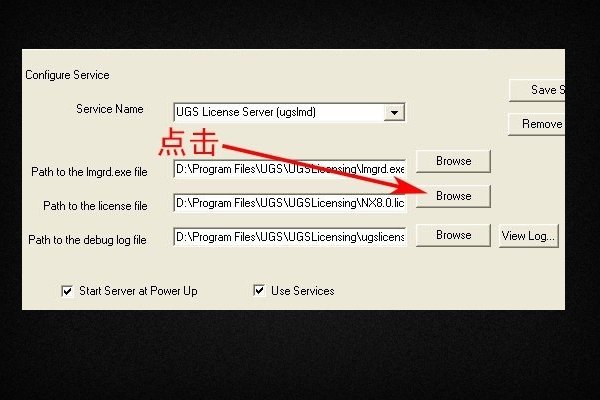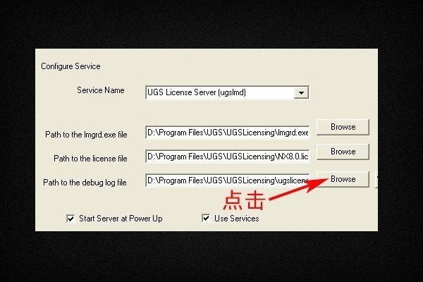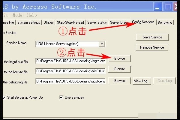 1、以管理员的身份打开UG许可证文件"lmtools",先点击"Config Services ",再点击下图中箭头指向的”Browse"按钮。