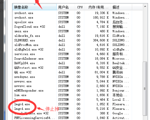 7、安装完成后按键盘 Ctrl+Alt+delete 打开任务管理器,停止结束两个lmgrd.exe任务,如下图所示。
