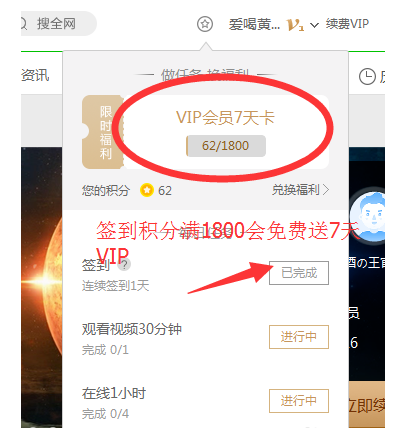 2、签到送VIP,签到非常的简单只需要登陆签到赚取一定的积分就可以赠送VIP;
