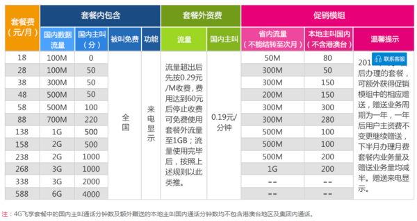 1.包含国内数据流量100M;全国被叫免费(除港澳台);另赠送来电显示。超出套餐后,国内主叫0.19元/分钟,国内数据流量0.29元/M。