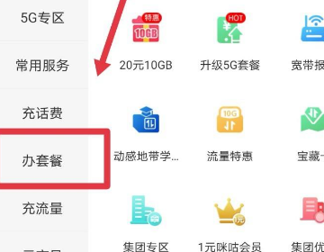 2、在业务办理页面,点击进入办套餐页面。