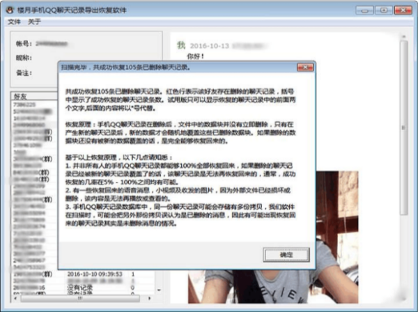 8.软件会在底层多次对数据库文件以二进制形式进行扫描并分析,因此恢复的时间可能会比较久,请耐心等待一下,恢复完成后,界面如下所示,我们就可以在软件上查看所有删除的手机QQ聊天记录了。