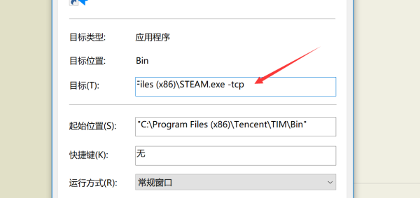 6.在快捷方式中的目标后面加个空格-TCP,然后点击确定按钮,重新启动steam客户端即可。