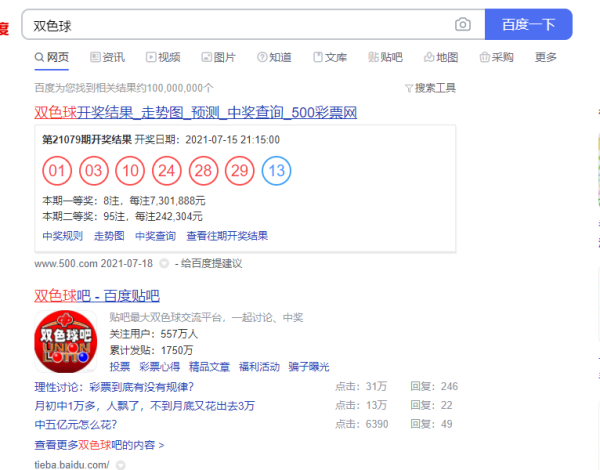 2、搜索框内添加双色球,点击百度一下。