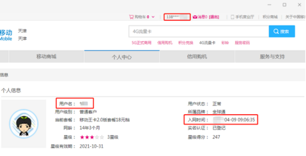 点击底导航栏【我的】→左上角【头像】-【个人信息】,保存包含登录手机号、入网时间、机主姓名的完整截图即可。