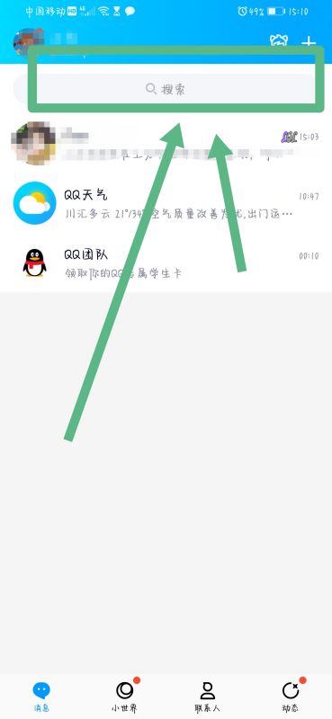 1.打开手机QQ,在消息界面找到最上方的搜索,点击搜索