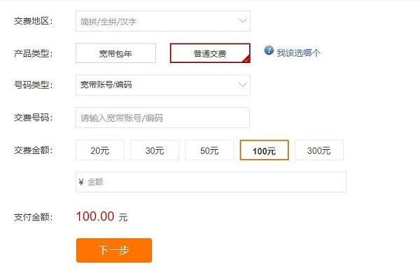 3、选择“普通续费”(千万别选择宽带包年!)号码类型选择“宽带账号/编码”,填写缴费号码,再进行充值。