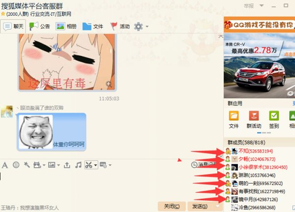 图中红色箭头所指的就是搜狐自媒体的客服人员,你可以加一下群问一下他们,他们态度很好的,大家也可以在群里相互沟通。