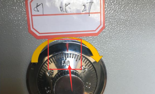 3、在第二组密码的基础上保持不动,顺时针转动转盘指向第三组密码27上,转动钥匙即可完成开锁。