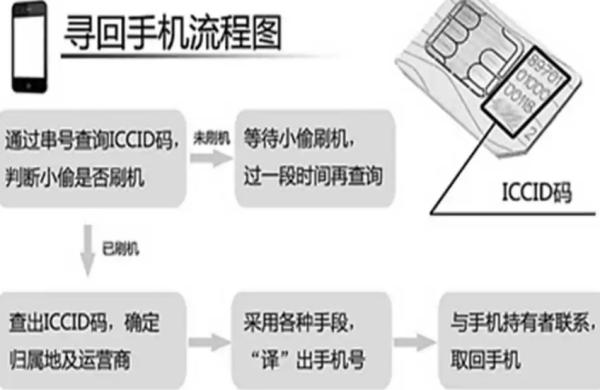 有不少丢友通过iccid找回方法找回了自己的iphone,简单的描述就是当窃贼盗取手机之后进行刷机激活,会将手机卡的iccid上传到服务器,通过某种渠道可以查询到刷机时间和iccid,通过运营商解析号码从而了解到手机的去向。