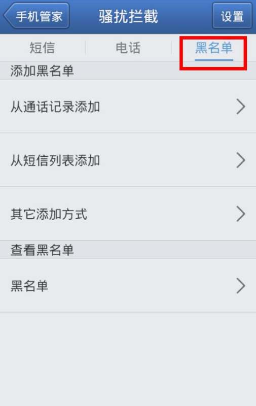 4.在黑名单中,可以自行添加号码进行拦截,在“其它添加方式”中还可以手动三种添加方式: