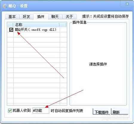 在软件上面安装需要的插件如问答系统,智能聊天,定时广播,每日签到,积分系统,QQ群管家,VIP群管,菜单插件,综合游戏等插件,再对机器人的插件功能进行相应的设置。