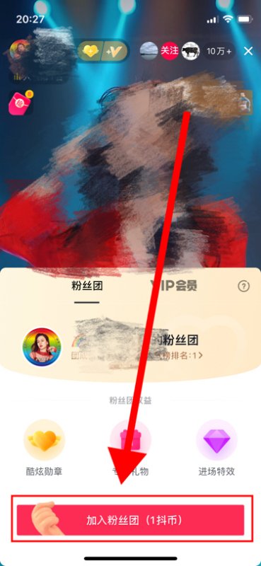 4.在最下方可以点击加入粉丝团,但是需要一个抖币,也就是相当于一毛钱的费用(如下图):