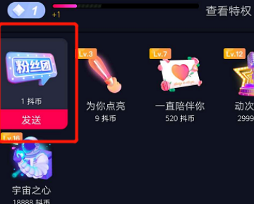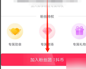 3、接着在打开的页面中,加入粉丝团,需要花1抖币,如下图所示。