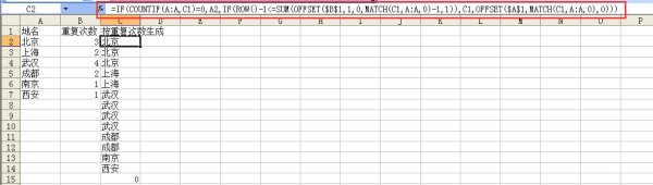 第二种情况相对有点复杂,我也是一步步的写出的公式,主要思路是:比如我要看单元格C6应该是哪个城市,我先看C5单元格里的城市数量有没有达到重复的次数,如果达到了,那C6单元格就是下一个城市,如果达不到那就还是C5单元格的城市