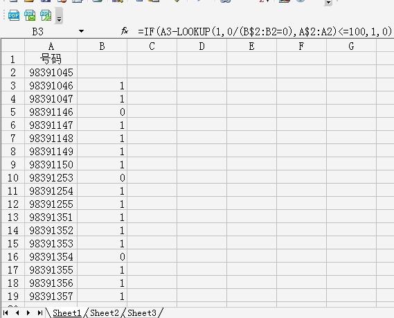 首先把号码输入在A列,按降序排序。然后在B2单元格输入公式:=IF(A2-LOOKUP(1,0/(B$1:B1=0),A$1:A1)<=100,1,0),向下填充。最后把值为1的行删除,剩下的就是需要的!