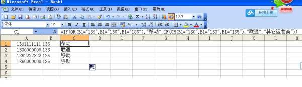 =IF(OR(B1="139",B1="136",B1="186"),"移动",IF(OR(B1="130",B1="133",B1="155"),"联通","其它运营商"))