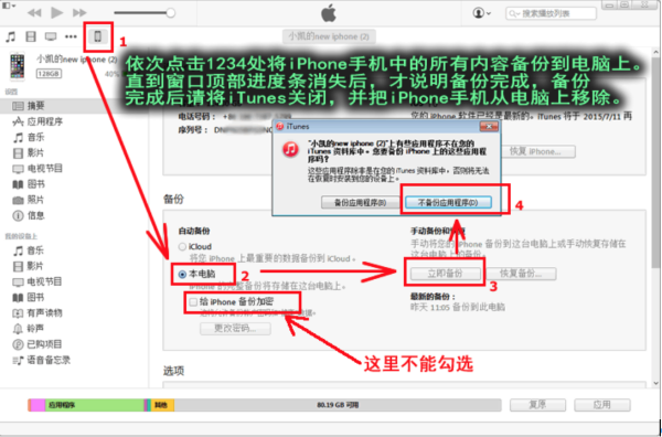 2、在电脑上安装并打开iTunes软件,按下图所示1234的顺序,将iPhone手机上的全部内容都备份