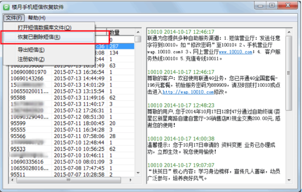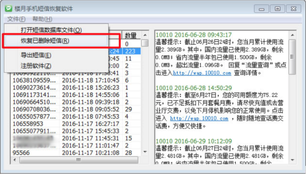 如果需要查询删除的短信内容的话,请点击“文件”,“恢复已删除短信”菜单,如下图所示: