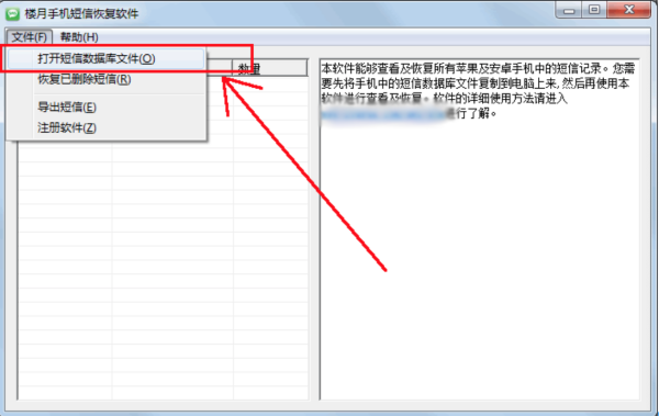 7、接下来请在电脑上下载并打开楼月手机短信恢复软件,点击“文件”,“打开短信数据库文件”菜